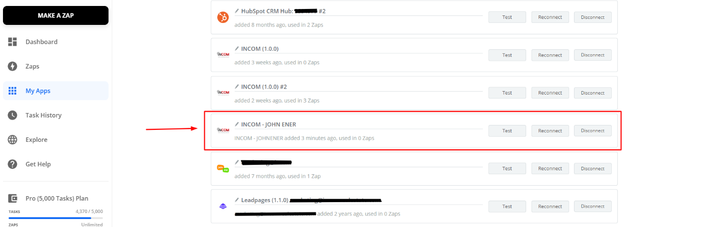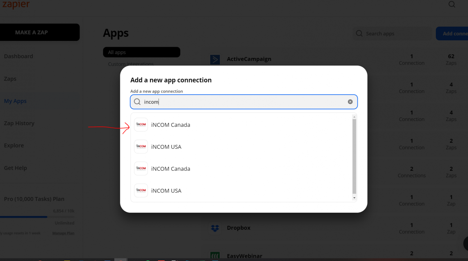 To get started with iNCOM on Zapier, first you will need to visit My Apps section on Zapier and click “Connect a new account…” and pick iNCOM from the dropdown menu.