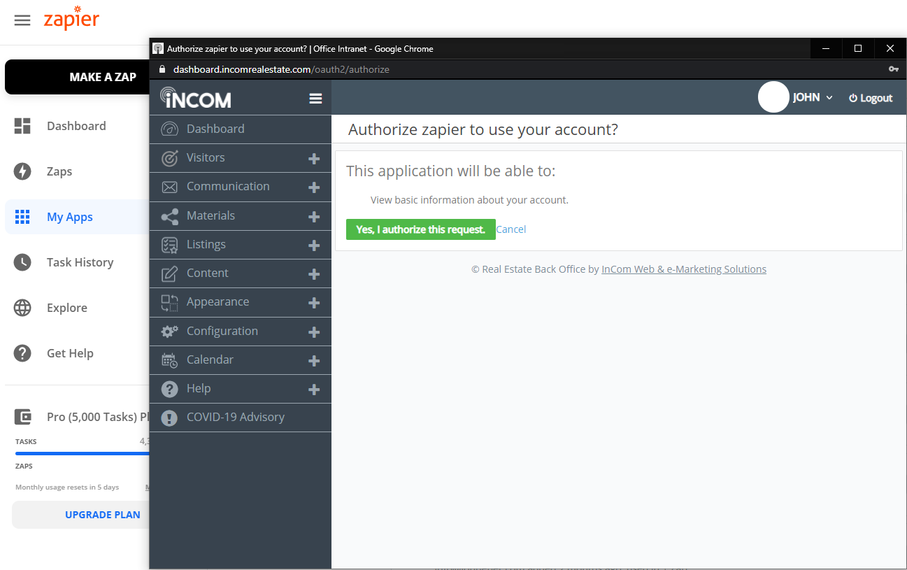 After logging in, you’ll now be asked to authorize Zapier to use your iNCOM account. Click “Yes, I authorize this request”.